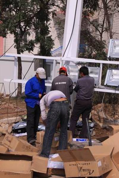 圖3為繁忙的看臺(tái)吊裝施工的場景