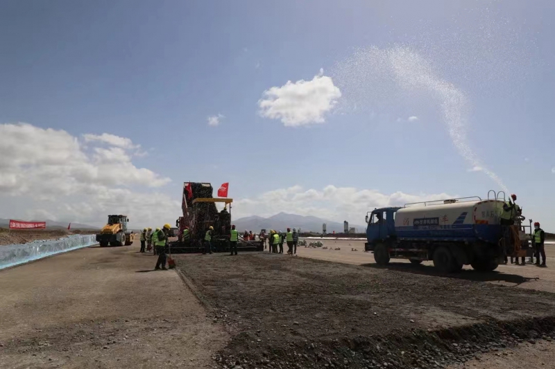 5月28日,伴隨著第一車水泥穩(wěn)定砂礫混合料緩緩倒入攤鋪機(jī)料斗,標(biāo)志著由我司承建的新疆和靜(巴音布魯克)機(jī)場(chǎng)飛行區(qū)跑道水穩(wěn)基層試驗(yàn)段施工正式拉開序幕。