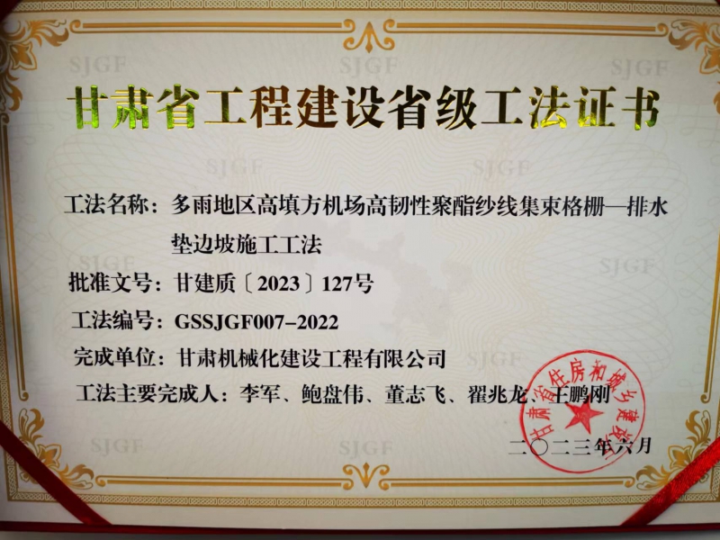 近年來,我司不斷加強(qiáng)技術(shù)創(chuàng)新和精品工程創(chuàng)建,科技創(chuàng)新能力和工藝水平再上新臺(tái)階。在承建的麗水機(jī)場土石方工程02標(biāo)段中,面對(duì)多雨地區(qū)高填方施工中的重難點(diǎn),公司專門組建了科研和施工小組,通過大量現(xiàn)場工藝實(shí)踐、工藝改善,提煉出項(xiàng)目重難點(diǎn)的關(guān)鍵技術(shù)。2023年6月,獲得了“多雨地區(qū)高填方機(jī)場高韌性聚酯紗線集束格柵—排水墊邊坡施工工法”。